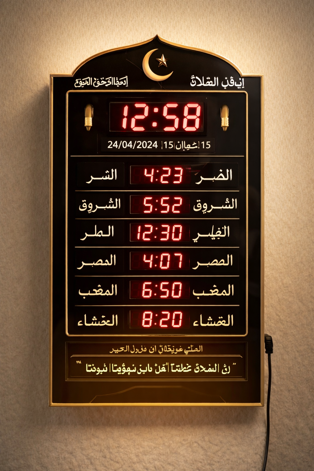 ساعة إلكترونية مخصّصة للمساجد، تعرض أوقات الصلاة بدقة عالية مع تنبيهات واضحة.
